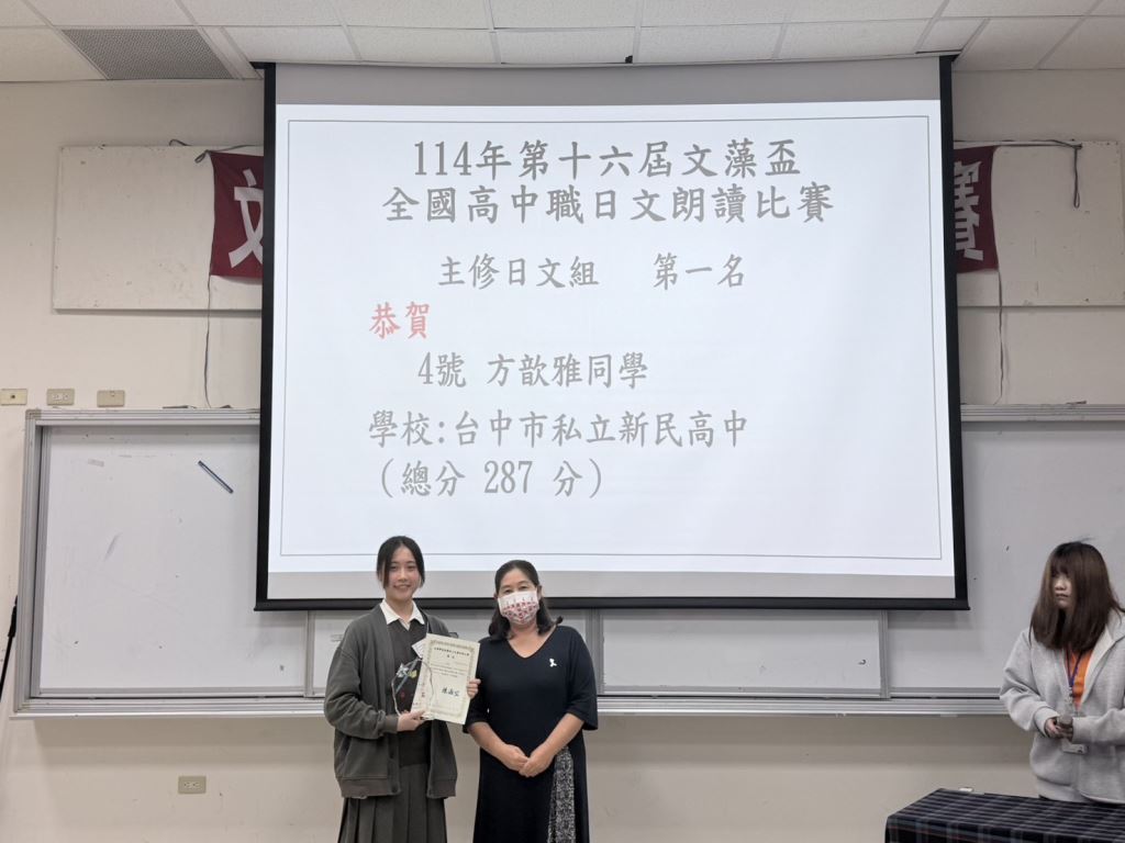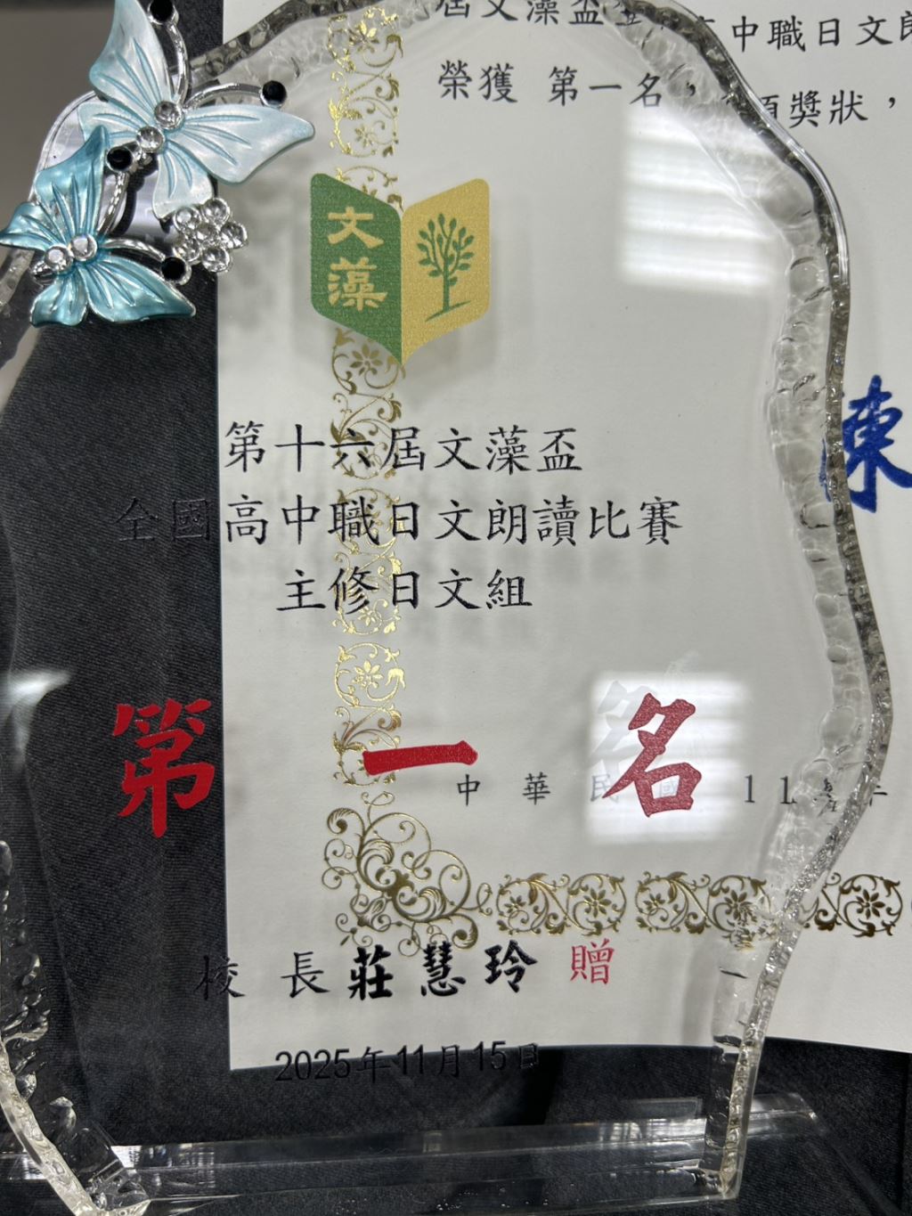 雅さん榮獲文藻盃全國高中職日文朗讀比賽 主修日文組 第1名,